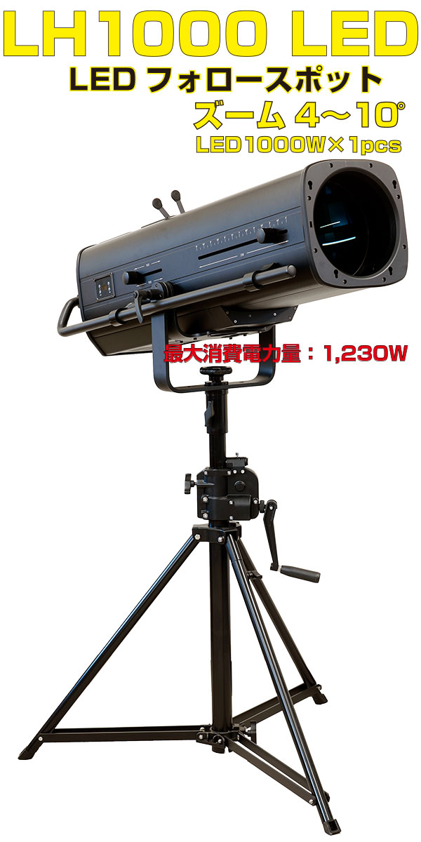 クセノン1000w クラスのフォローピンの置き換えに、より明るい1000w LED フォローピンです。25m スロータイプ。省電力、省スペース、壁コンからの給電が可能です。カラーチェンジャー、ゴボホルダー別売です。
